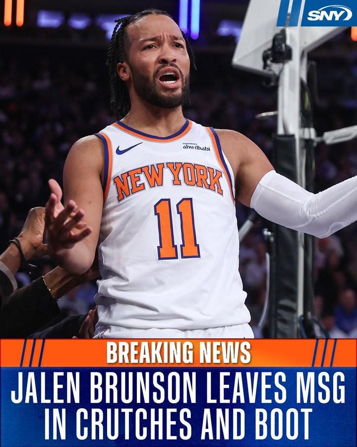 據(jù)The Athletic記者James L.Edward III報道,尼克斯隊球星杰倫-布倫森在賽后拄著拐杖并穿著保護靴離開了麥迪遜廣場花園球館。愛德華茲表示,尼克斯隊并未就布倫森的傷情發(fā)布官方報告,但主教練邁克-布朗透露,布倫森在比賽臨近結(jié)束時扭傷了腳踝。當時布倫森似乎在突破上籃時扭傷了右腳踝。