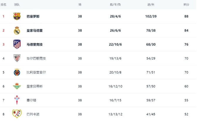 本賽季巴薩力壓皇馬獲得了聯(lián)賽冠軍。巴薩38場(chǎng)聯(lián)賽取得28勝4平6負(fù)的成績(jī),拿到了88分,奪得聯(lián)賽冠軍。而皇馬則取得26勝6平6負(fù)的成績(jī),拿到84分,以4分的差距排名第2,無(wú)緣冠軍。
