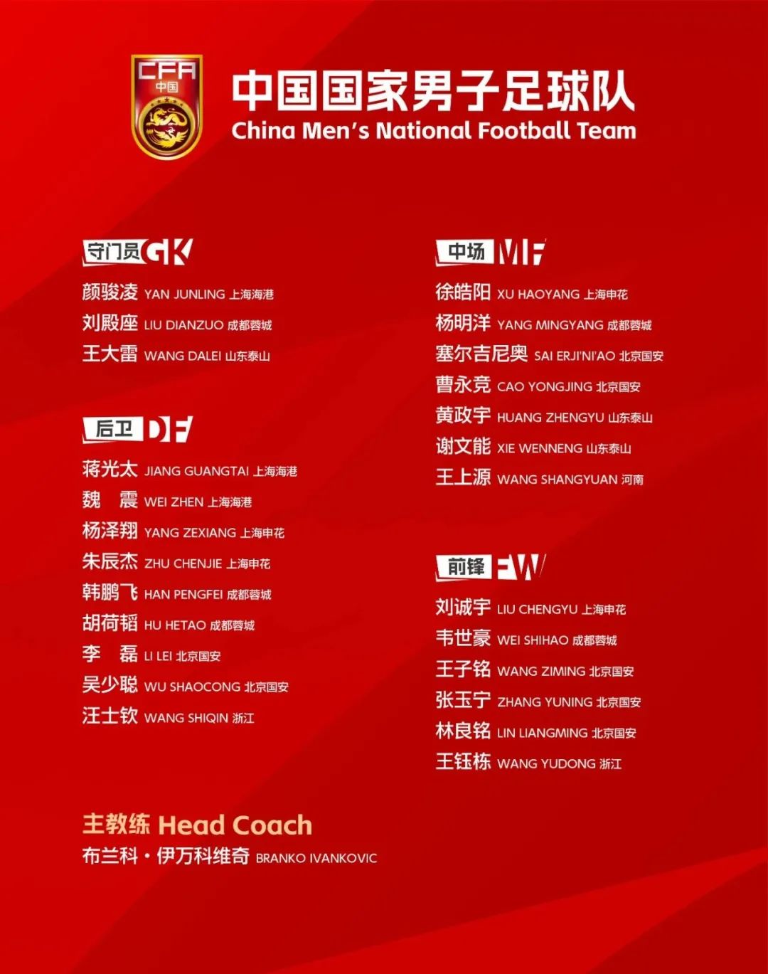 此前武磊因傷提前退出集訓,劉若釩也未能入選。由于謝文能、林良銘停賽,所以中國隊本輪比賽的23人陣容已經確定。