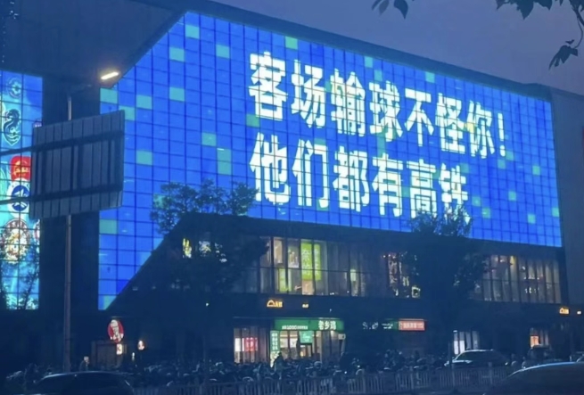 泰州首輪2-0贏下無錫隊,第二輪0-3不敵鹽城,泰州天虹購物中心打出安慰語,“客場輸球不怪你,他們都有高鐵”。