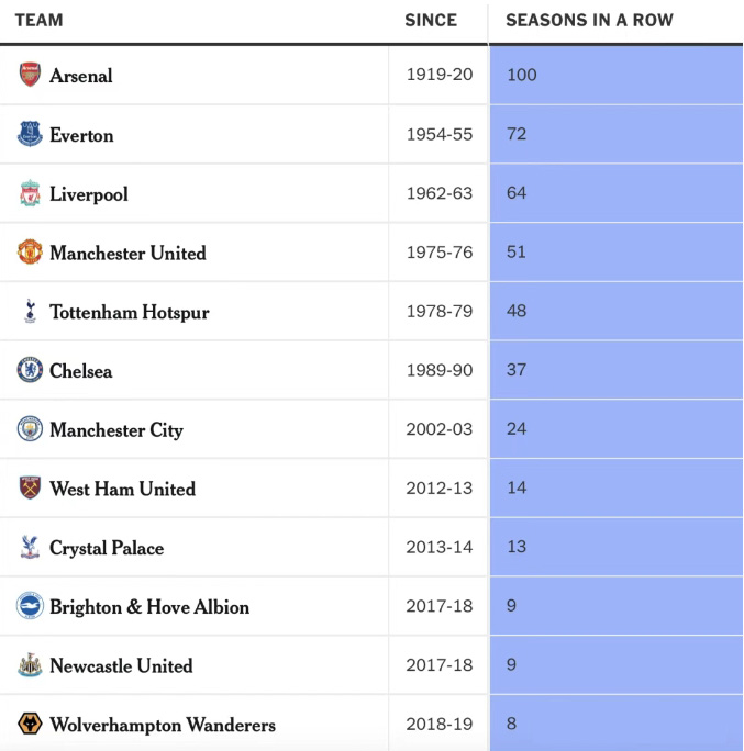 以下是英格蘭頂級聯(lián)賽歷史上連續(xù)參賽時間最長的十支球隊,其中前六名中有五支目前仍在頂級聯(lián)賽。