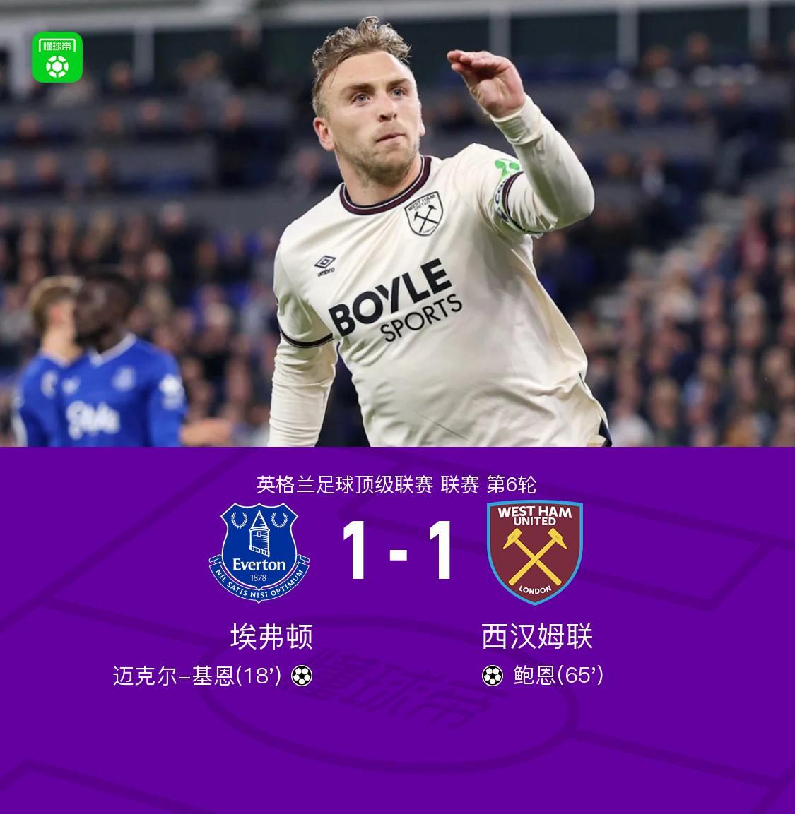北京時間9月30日英格蘭足球頂級聯賽聯賽第6輪,埃弗頓主場對陣西漢姆聯。埃弗頓邁克爾-基恩破門,西漢姆聯鮑恩破門扳平比分。最終比分埃弗頓1-1西漢姆聯。