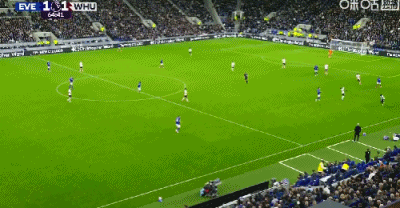 第65分鐘,鮑恩禁區右路兜射遠角破門,埃弗頓1-1西漢姆聯