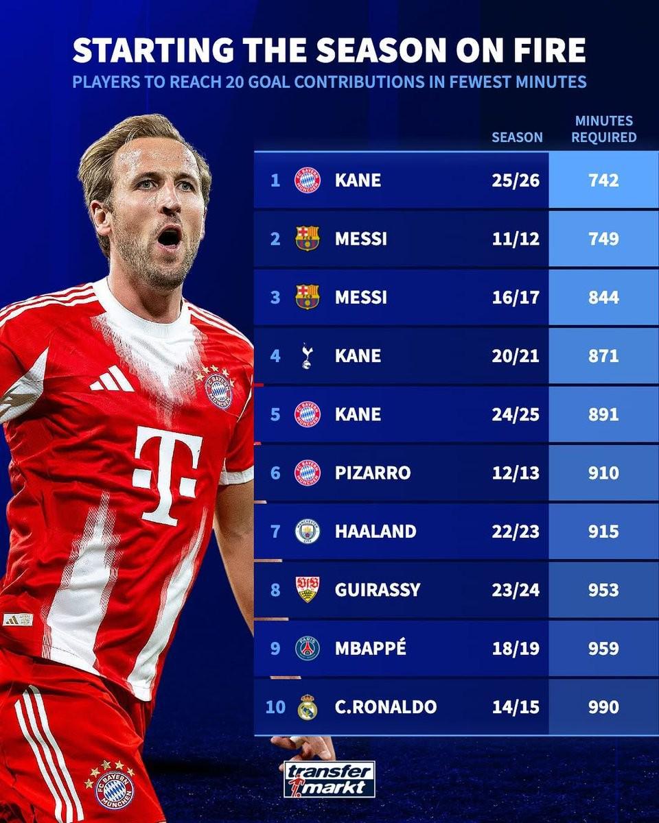 凱恩本賽季代表拜仁在各項賽事出場742分鐘已直接參與20球,包括17球3助。據德國轉會市場網站統計,凱恩是參與賽季前20球所用時間最少的球員。