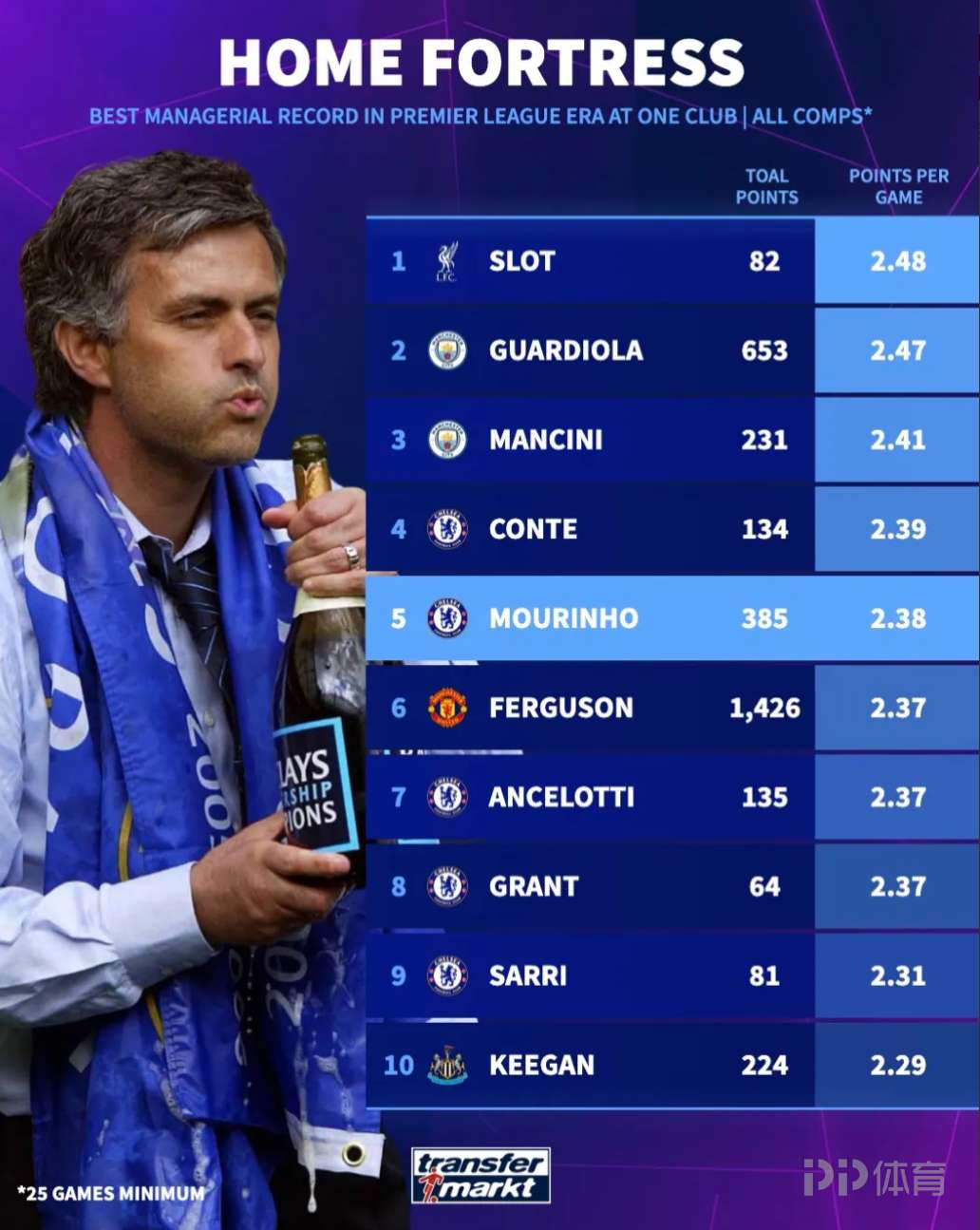 德轉統計了英超時代教練主場各項賽事場均得分排行榜。目前利物浦主帥斯洛特和曼城主帥瓜迪奧拉場均分別得2.48分和2.47分,排名前二。本周早些時候重返切爾西主場斯坦福橋的穆里尼奧在切爾西的主場執教成績位列英超時代所有教練的第五位。