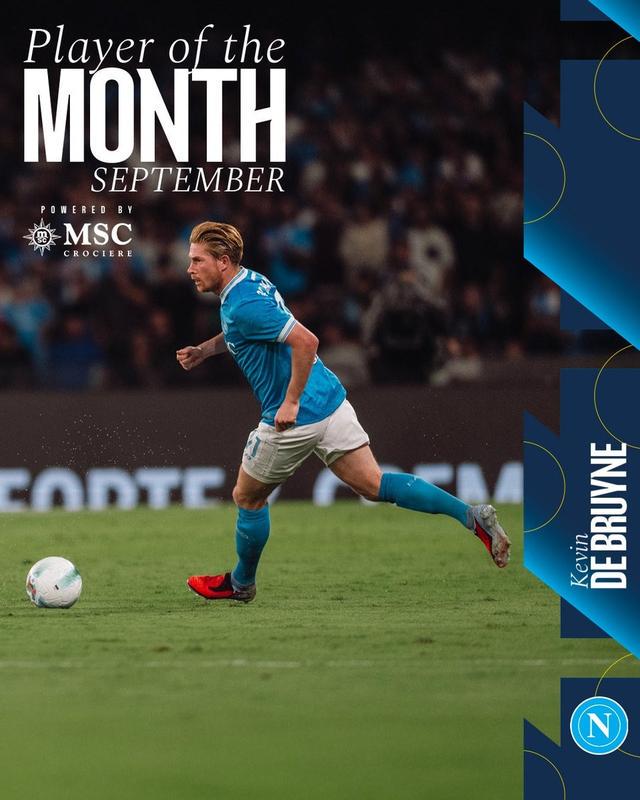 官方消息,德布勞內(nèi)當(dāng)選那不勒斯9月最佳球員。