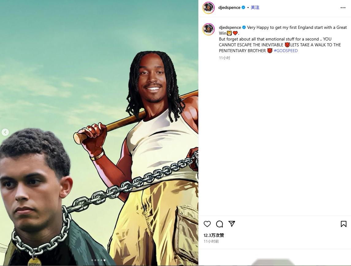 比賽結(jié)束后,斯彭斯在社交媒體上發(fā)表動(dòng)態(tài),并配文:“非常高興在英格蘭隊(duì)首次首發(fā)并取得一場(chǎng)精彩的勝利??。但先把這些情感放在一邊……你無(wú)法逃避不可避免的事情,兄弟,讓我們?nèi)ダ卫镒咭惶税伞!?