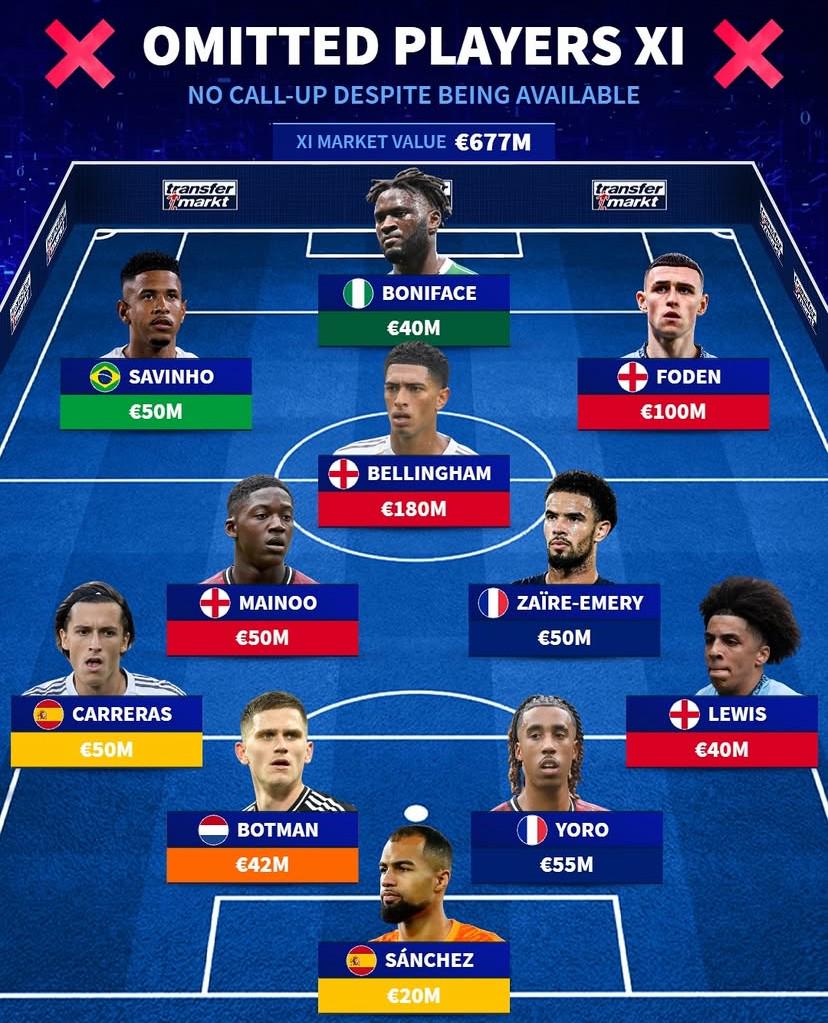 北京時間10月11日,德轉列出了此次能夠入選但未被各自國家隊征召的最貴11人陣容,貝林厄姆、福登領銜,約羅、梅努、卡雷拉斯在列。