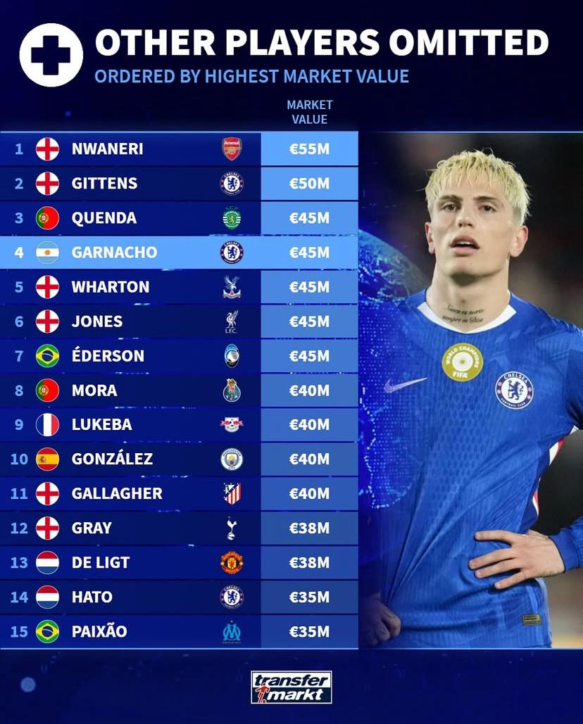 福登(英格蘭/曼城)1億歐元、博尼費斯(尼日利亞/云達不萊梅)4000萬歐元、薩維尼奧(巴西/曼城)5000萬歐元