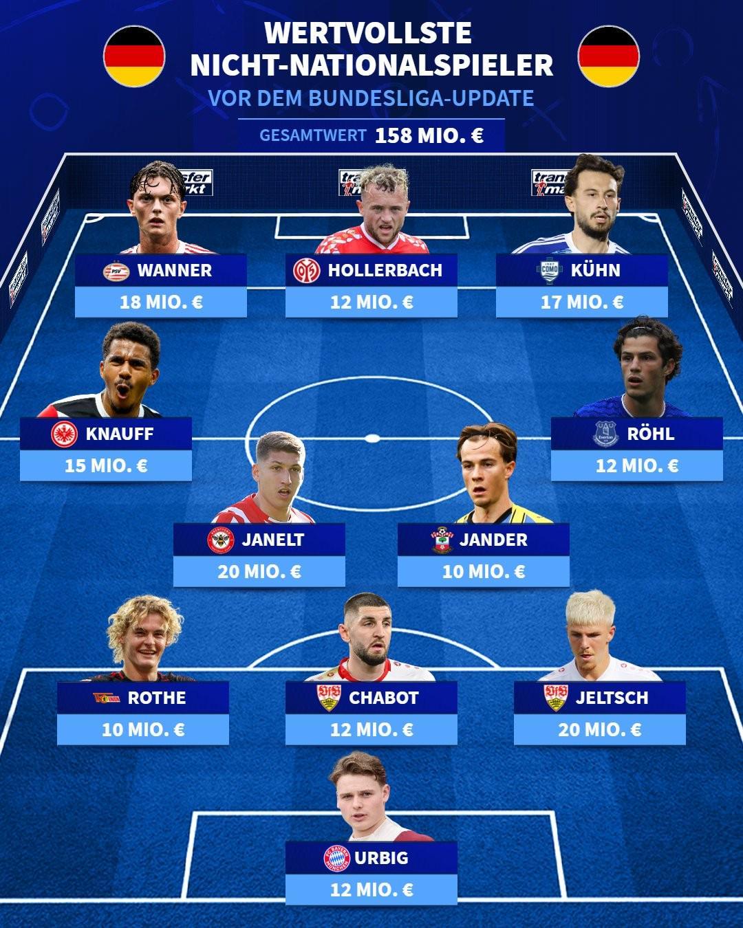 北京時間10月11日,德轉統計出了從未入選過德國成年國家隊的現役最貴德國11人陣容,布倫特福德中場雅內爾特以及斯圖加特后衛耶爾奇以2000萬歐元的身價領銜,拜仁慕尼黑的門將烏爾比希以及今夏轉會埃因霍溫的保羅-萬納在列。