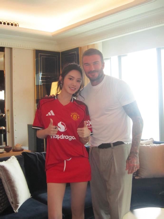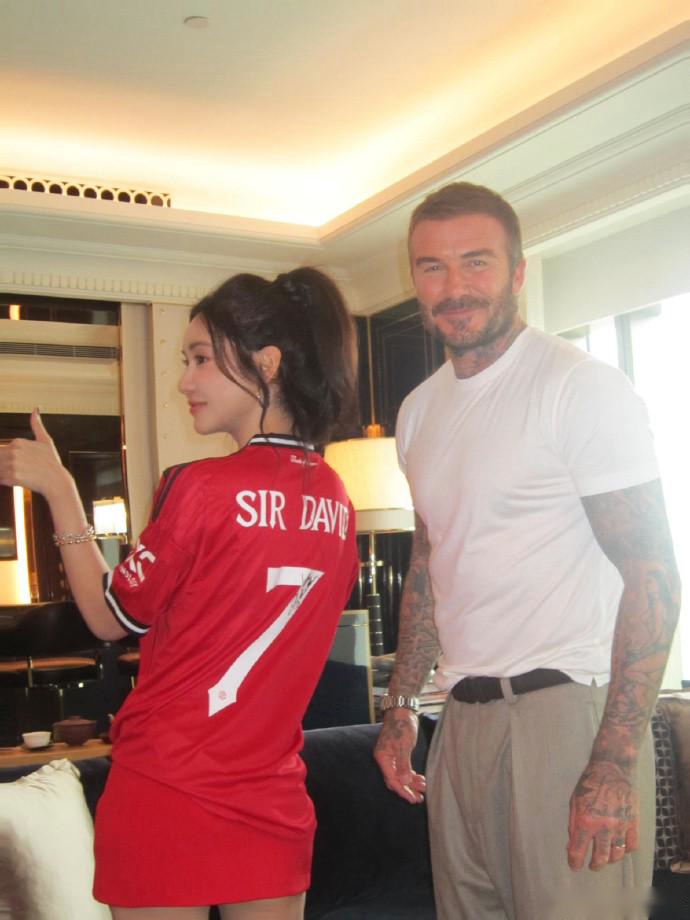 此前,貝克漢姆還與籃球主持人美娜合影,美娜則是穿上了印有貝克漢姆名字的曼聯7號球衣。