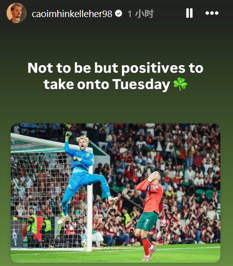 比賽第75分鐘,特林康造點(diǎn),C羅主罰點(diǎn)球被凱萊赫用腳擋出。凱萊赫曬出這張撲出C羅點(diǎn)球慶祝照,并配文:結(jié)果雖未如愿(愛爾蘭輸?shù)舯荣悾芏詫⒂瓉矸e極影響。