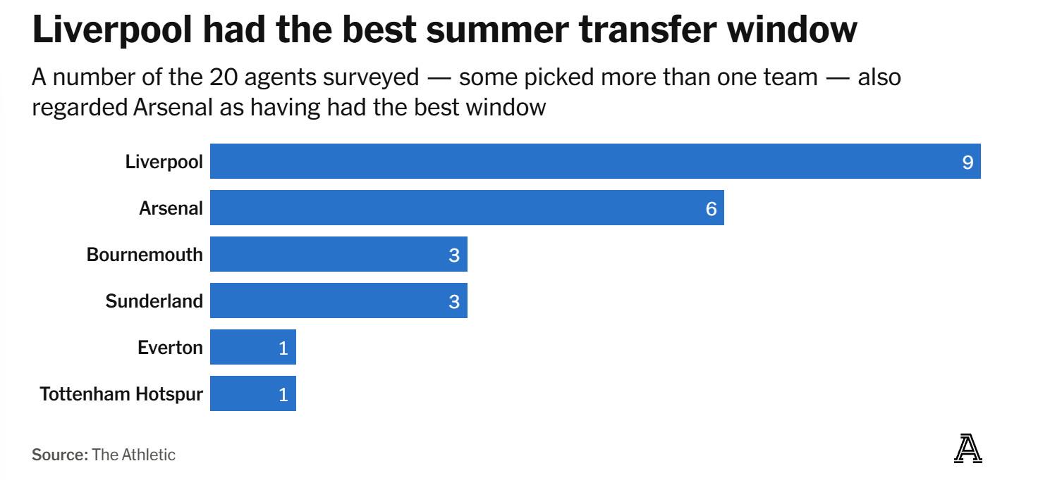 阿森納實際上以六票位居第二。利物浦花費4.18億英鎊的采購狂潮(通過價值1.9億英鎊的球員銷售抵消)為他們贏得了贊譽和榜首位置,盡管幾位新援尚未產生化學反應。