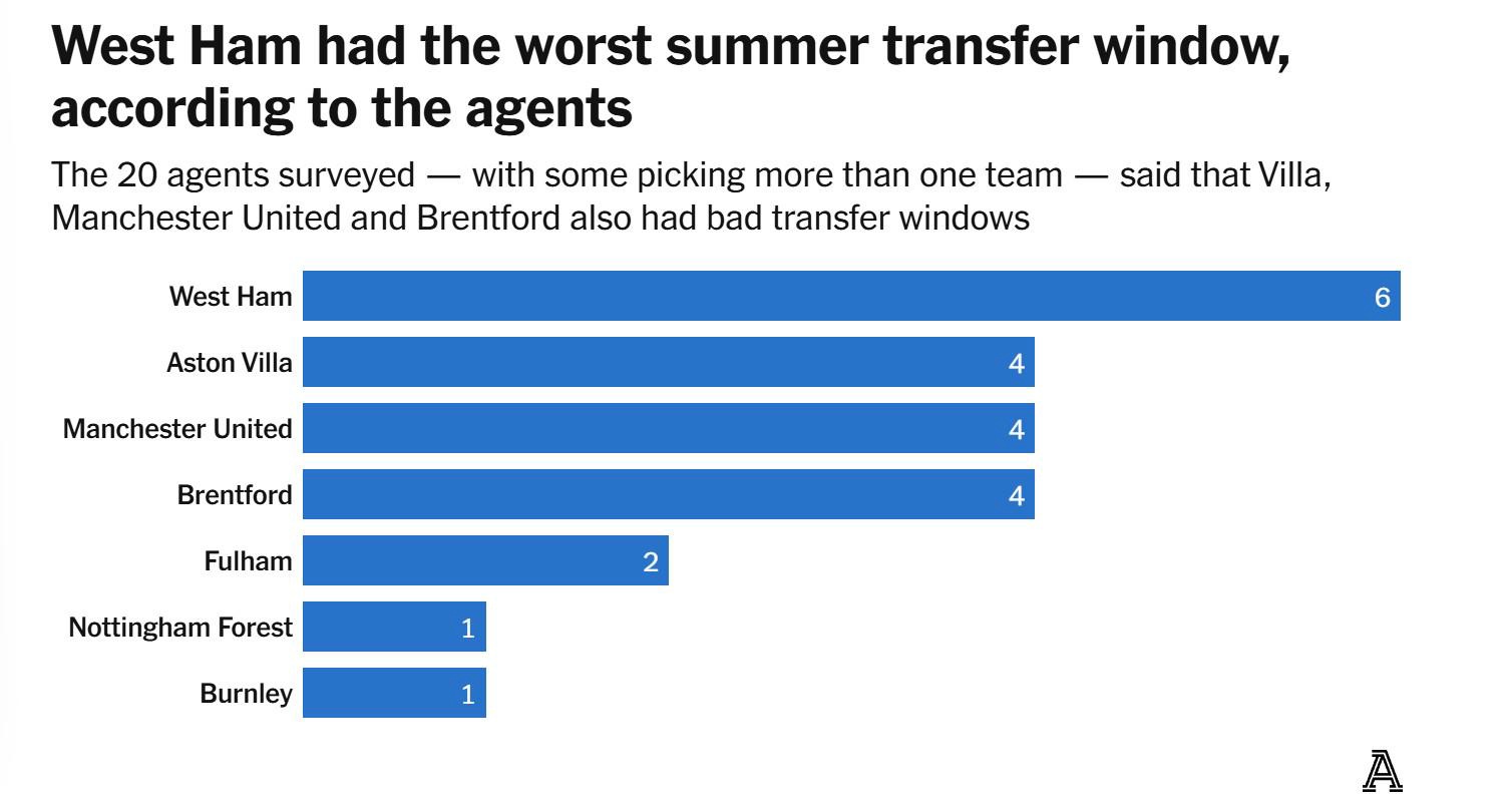 維拉被描述為在夏季窗口后“正在倒退”,伯恩利“上賽季租借了那么多帶有強制買斷條款的球員,把事搞砸了”,富勒姆在幾乎沒有加強實力后“可能會開始擔心了”。