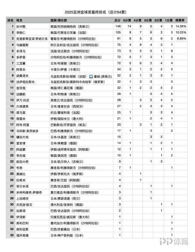 《體壇周報》公布2025亞洲金球獎投票結果,孫興慜146分第10次奪魁,李剛仁105分排名第二,C羅91分排名第三。