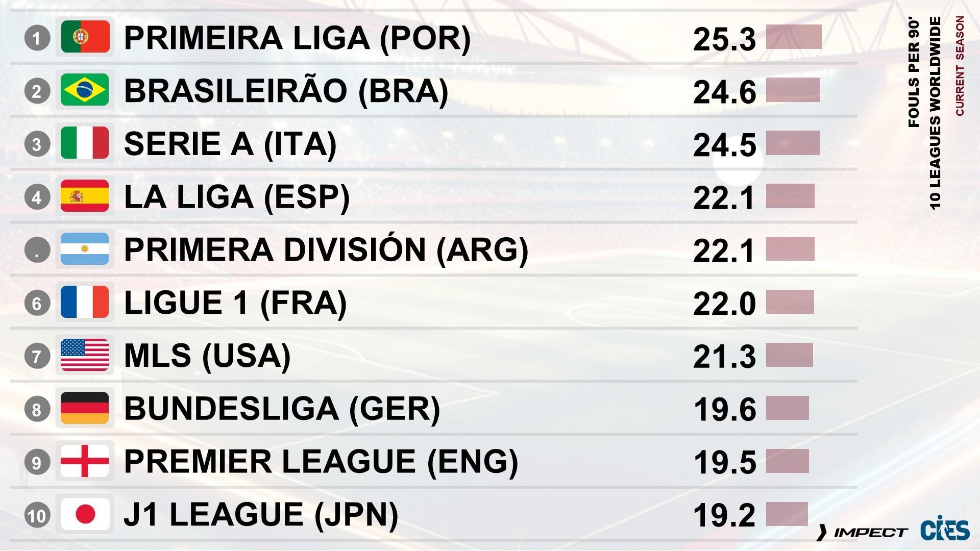 當地時間10月13日,瑞士足球天文臺統計了各國聯賽每90分鐘的犯規情況,其中葡超以25.3次犯規位居榜首,巴甲以24.6次位列第二,意甲以24.5次位列第三。