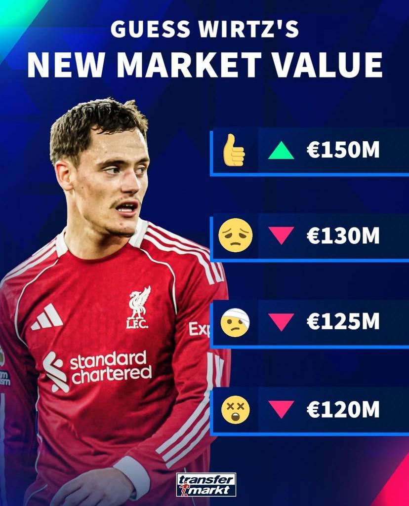 10月17日德轉(zhuǎn)就將更新英超球員的身價,對此他們給目前身價1.4億歐元的維爾茨做了預(yù)熱,并且給出了四個身價選項,分別是上漲至1.5億歐元、下跌至1.3億歐元、下跌至1.25億歐元以及下跌至1.2億歐元。