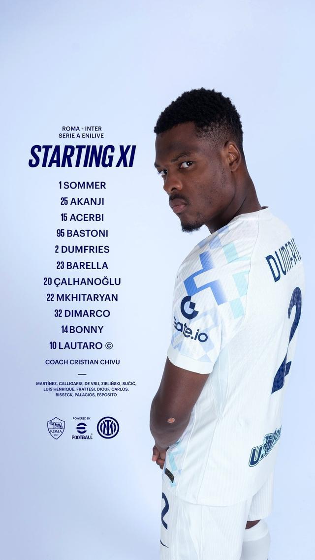 國米首發:1-索默、25-阿坎吉、15-阿切爾比、95-巴斯托尼、2-鄧弗里斯、23-巴雷拉、20-恰爾汗奧盧、22-姆希塔良、32-迪馬爾科、14-博尼、10-勞塔羅