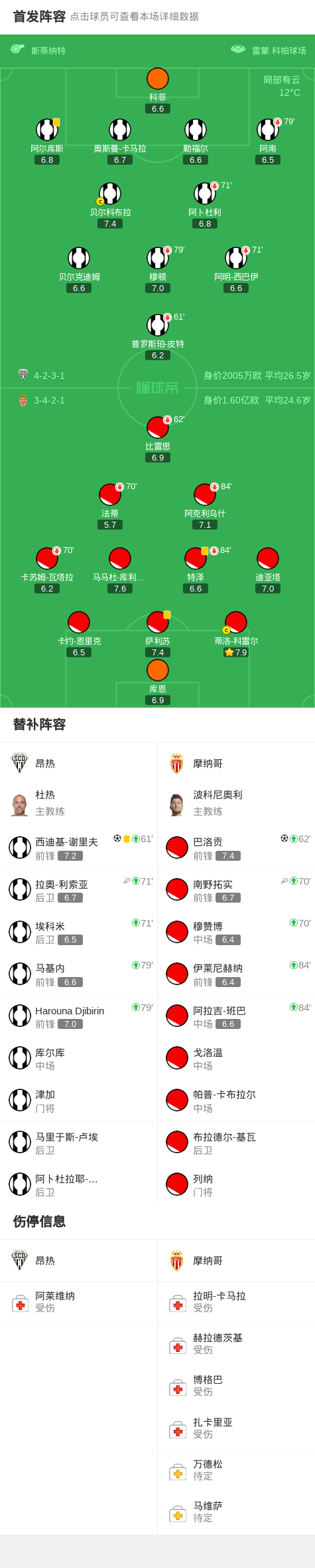 第72分鐘,南野拓實助攻,巴洛貢抽射破門,摩納哥1-0領先