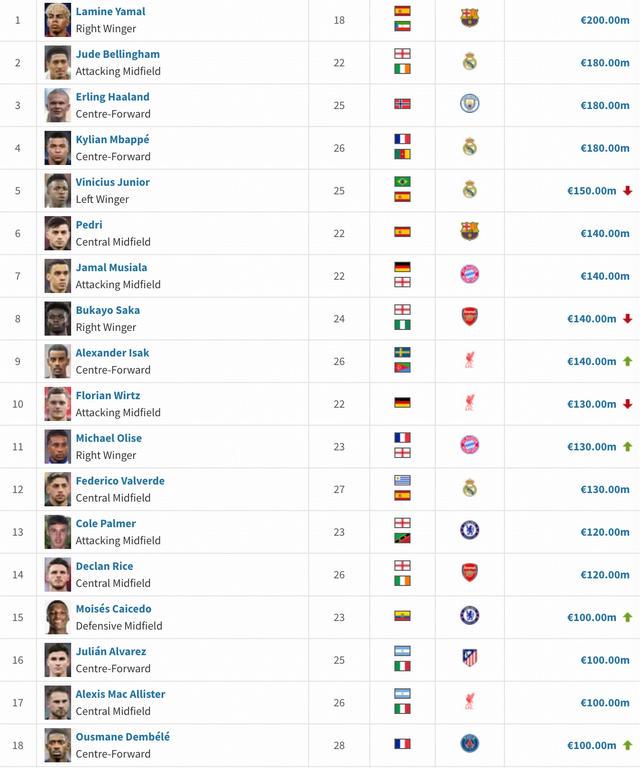 隨著英超和德甲球員身價的更新,在德國轉會市場身價榜上,目前有18位身價過億的球員,五大聯賽中僅意甲沒有球員上榜,登貝萊與凱塞多的身價來到了1億歐,福登身價跌至8000萬歐,羅德里身價從1.1億歐降至9000萬歐。