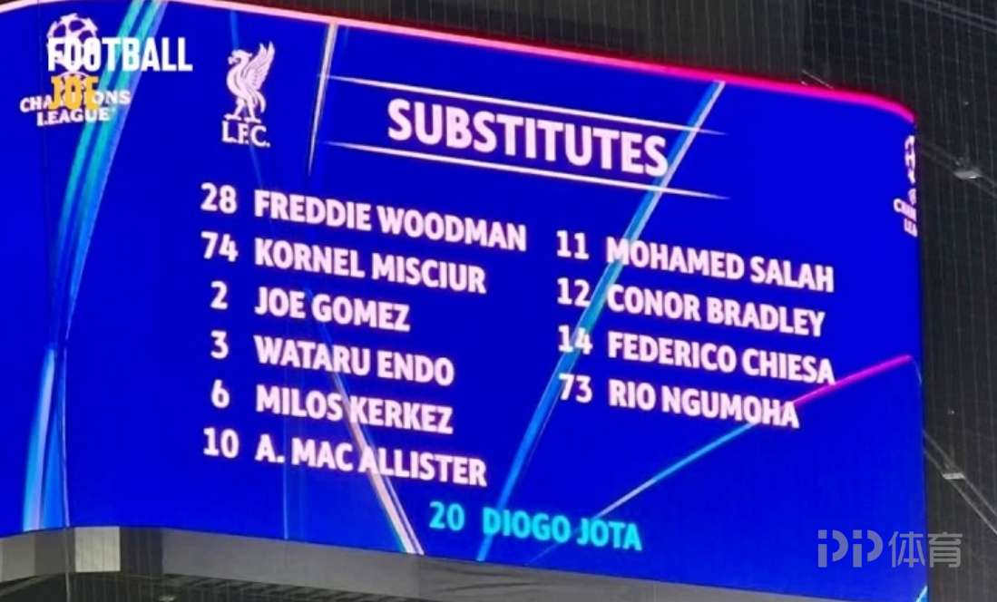 歐冠第3輪,利物浦客場對(duì)陣法蘭克福,賽前法蘭克福大屏幕為利物浦替補(bǔ)名單加上20號(hào)若塔。
