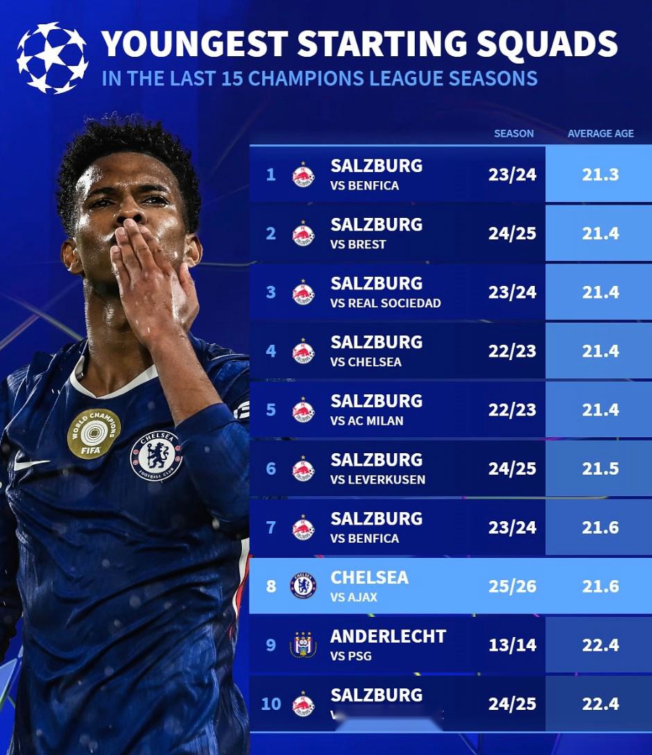 北京時(shí)間10月23日,切爾西在歐冠聯(lián)賽階段第3輪的比賽中主場(chǎng)5-1大勝10人作戰(zhàn)的阿賈克斯,吉烏、莫伊塞斯-凱塞多、恩佐-費(fèi)爾南德斯、埃斯特旺以及泰里克-喬治分別進(jìn)球。賽后根據(jù)德轉(zhuǎn)的統(tǒng)計(jì),切爾西本場(chǎng)比賽首發(fā)陣容的平均年齡僅為21.6歲,為歐冠近15個(gè)賽季第8年輕。