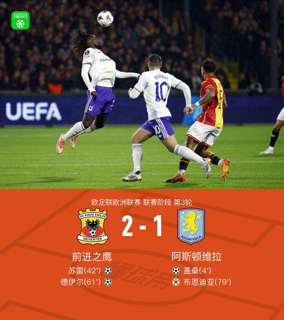 北京時間10月24日歐足聯歐洲聯賽 聯賽階段 第3輪,前進之鷹對陣阿斯頓維拉。上半場蓋桑開場閃擊,半場尾聲特維特開出任意球,蘇雷折射破門扳平比分。下半場約里斯-克拉默助攻德伊爾破門反超比分,之后布恩迪亞將點球踢飛。最終維拉客場1-2不敵前進之鷹。