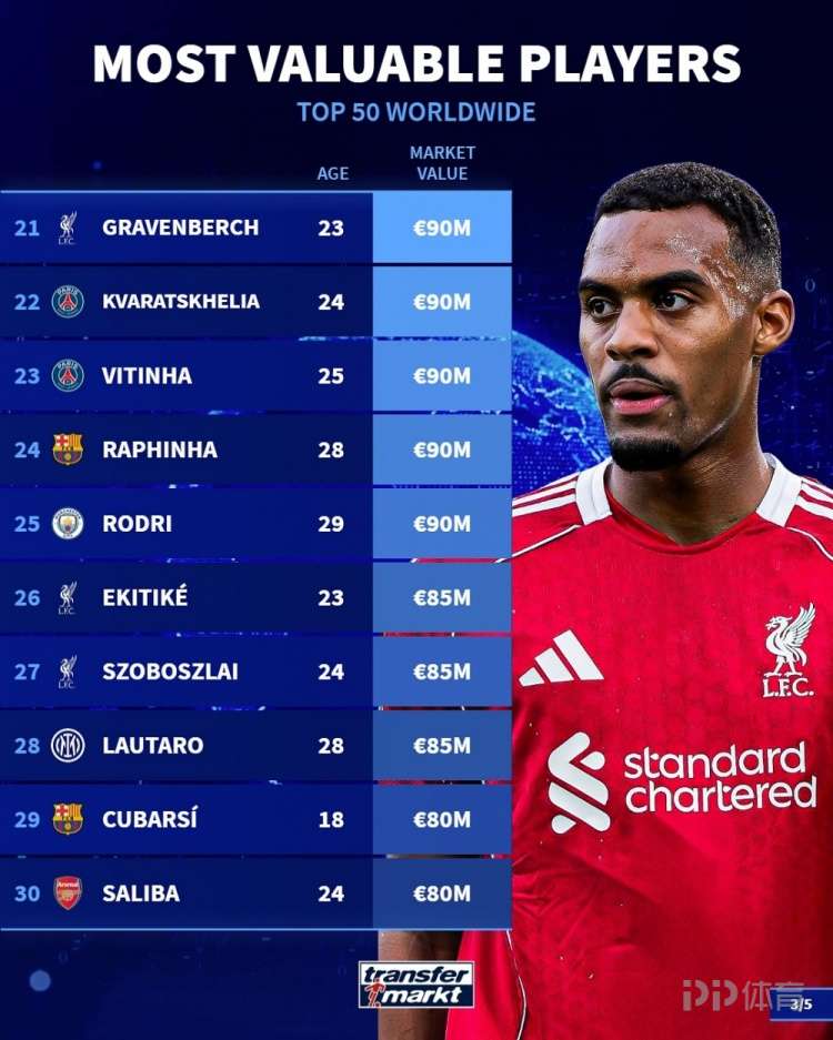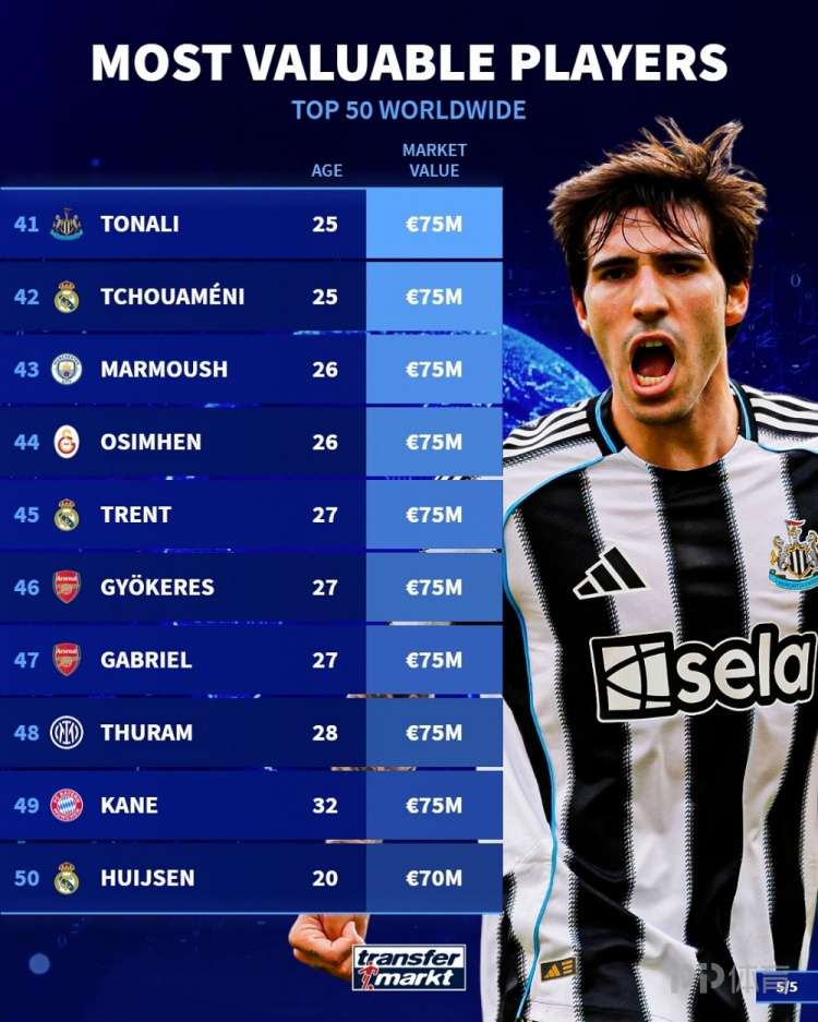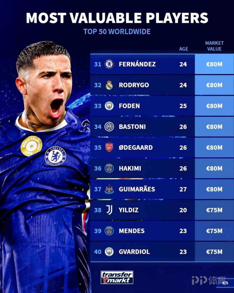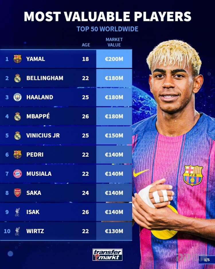 德國轉會市場列出了球員身價前50排名,亞馬爾2億歐居首,貝林厄姆、哈蘭德、姆巴佩1.8億歐次席。