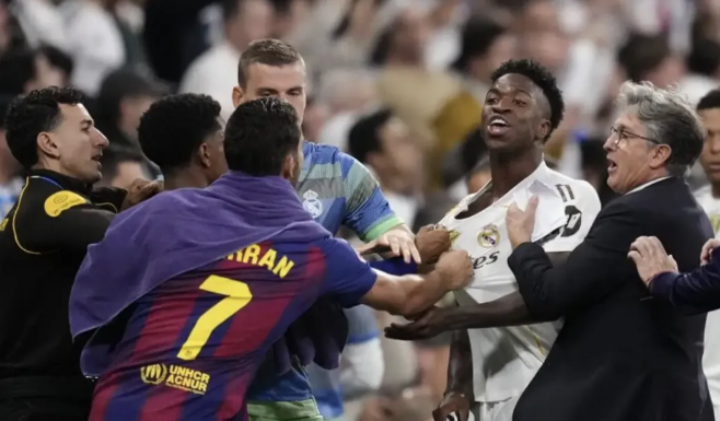 周日皇馬與巴薩的國(guó)家德比尾聲,球員情緒失控、險(xiǎn)些沖突,警方不得不介入分隔雙方。