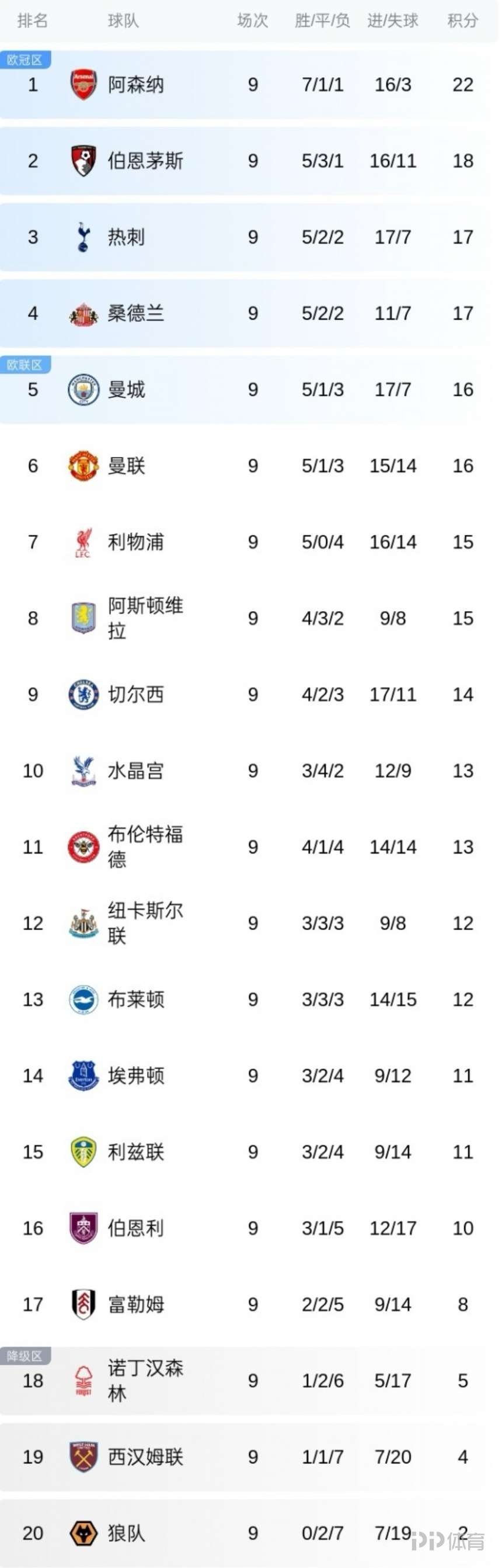 英超第9輪戰(zhàn)罷,本輪多場(chǎng)焦點(diǎn)戰(zhàn)爆出冷門,積分榜格局再次發(fā)生變化。阿森納在主場(chǎng)以1比0小勝水晶宮,憑借這場(chǎng)勝利,槍手以7勝1平1負(fù)積22分穩(wěn)居榜首;伯恩茅斯本輪2比0擊敗諾丁漢森林,目前他們以18分暫列第二,僅落后阿森納4分;熱刺在客場(chǎng)3比0完勝埃弗頓,以17分升至第三,重新回到爭(zhēng)冠集團(tuán)。曼聯(lián)4比2擊敗布萊頓,暫列第6名;切爾西主場(chǎng)1比2不敵桑德蘭,僅列第9;利物浦客場(chǎng)2比3不敵布倫特福德,目前排名第7;維拉憑借擊敗曼城的關(guān)鍵勝利,積分追平利物浦,排名第8。