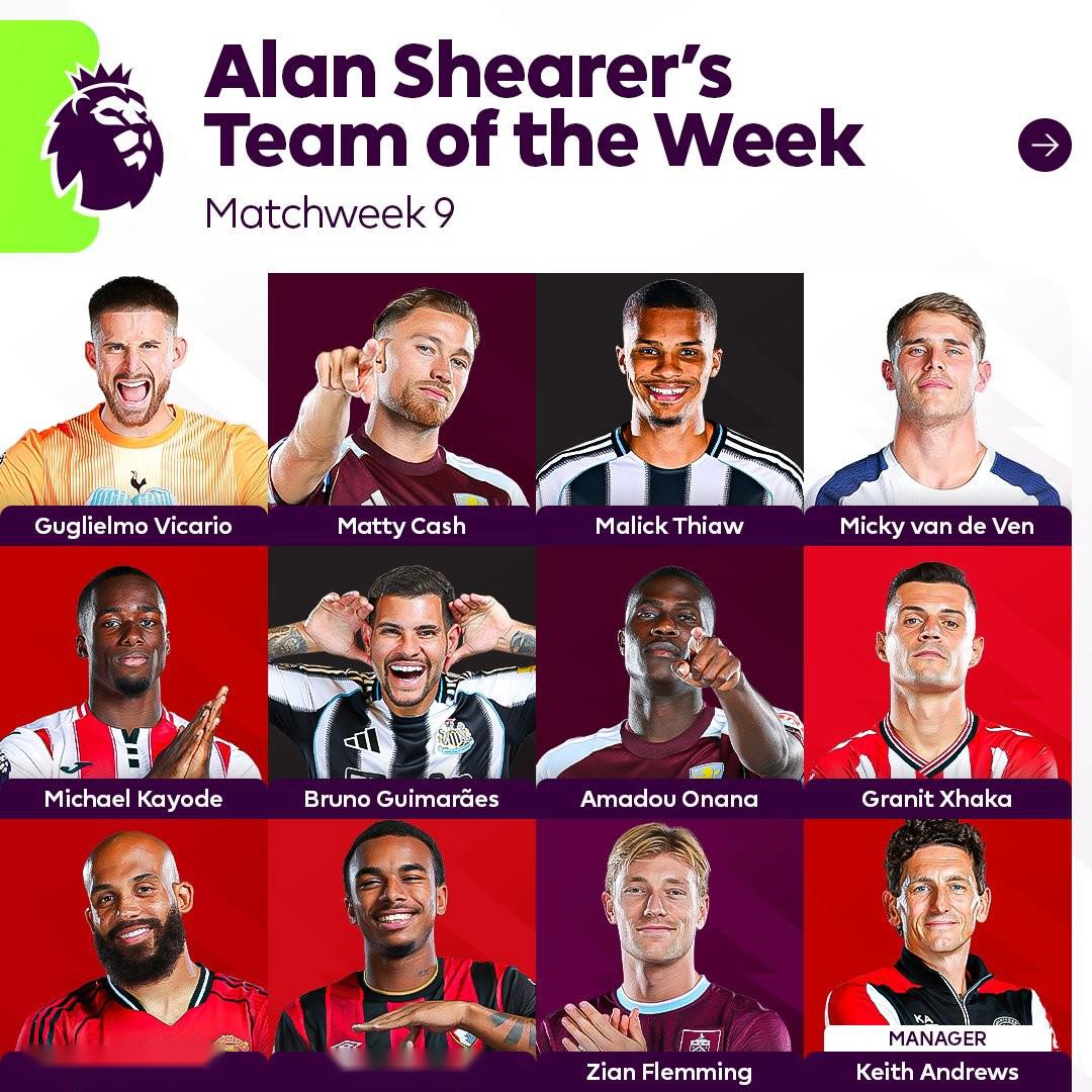 英超官方發布了阿蘭-希勒評選的英超第9輪最佳陣容,姆伯莫、扎卡、范德芬、維卡里奧等人在列。