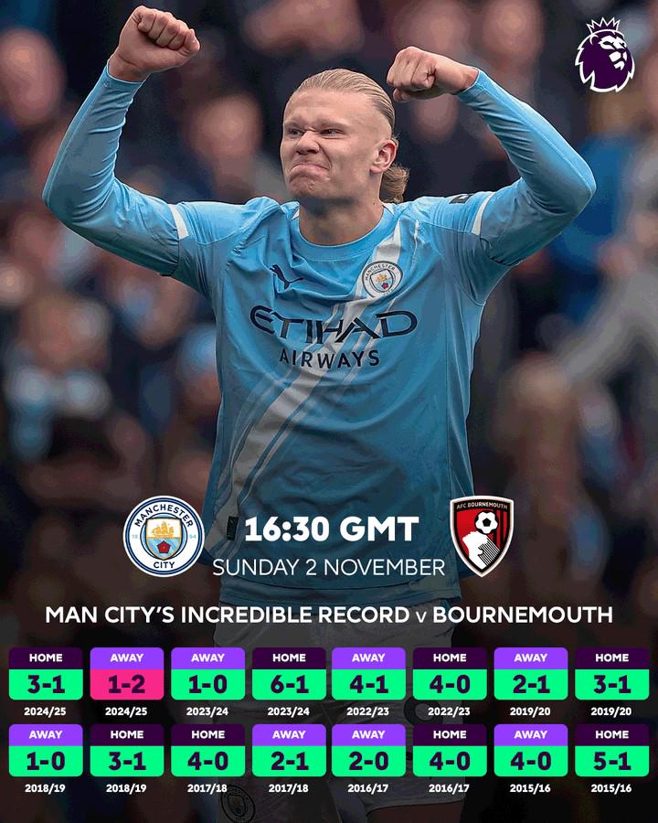 如果考慮各項賽事,曼城對伯恩茅斯的歷史總戰績則為21勝2平1負,打進63球丟16球。