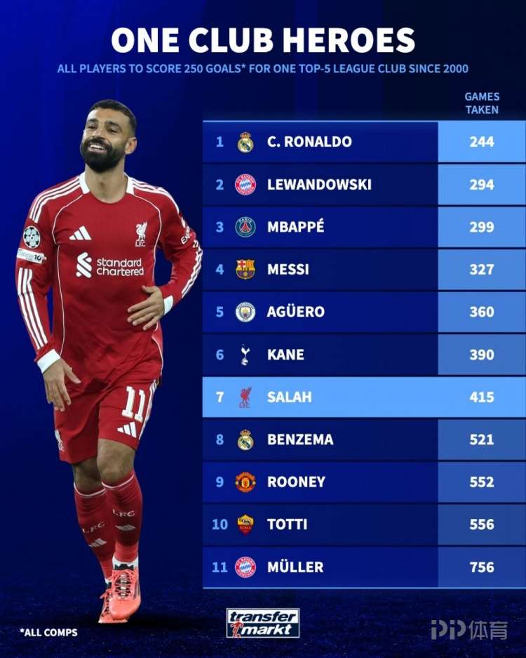 英超第10輪比賽,薩拉赫破門,利物浦主場2-0擊敗維拉。薩拉赫各賽事為利物浦攻入250球,德國轉會市場統計了本世紀五大聯賽球員為單一俱樂部攻入250球所用場次,并列出榜單。