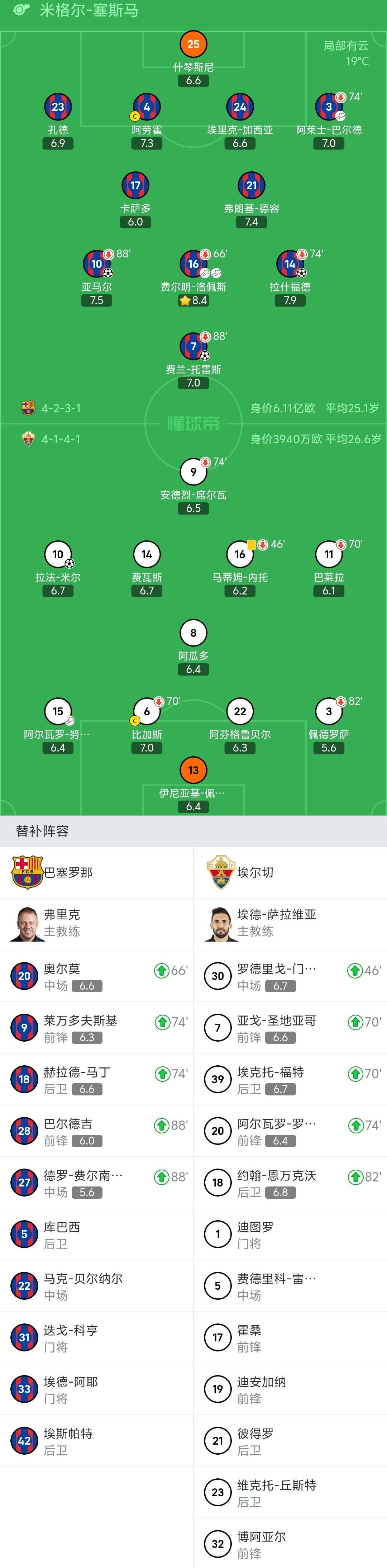 北京時間11月3日1:30,西甲第11輪繼續進行,巴塞羅那坐鎮主場迎戰埃爾切,本場主裁判為米格爾-塞斯馬。上半場,亞馬爾與費蘭三分鐘內接連破門,隨后拉法-米爾為埃爾切扳回一城。下半場,拉什福德爆射破門,拉法-米爾兩度中框。最終,巴薩主場3-1擊敗埃爾切。