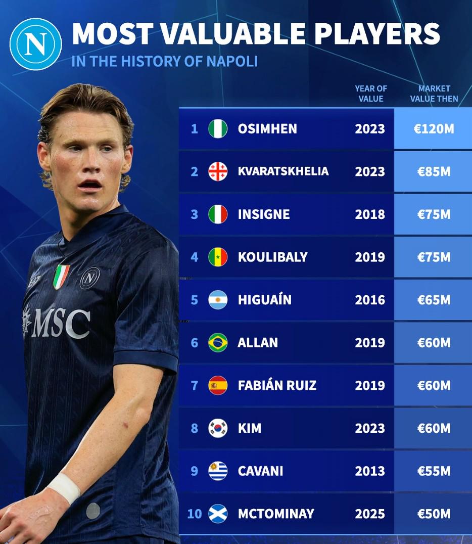 德轉統計那不勒斯隊史球員身價前10: