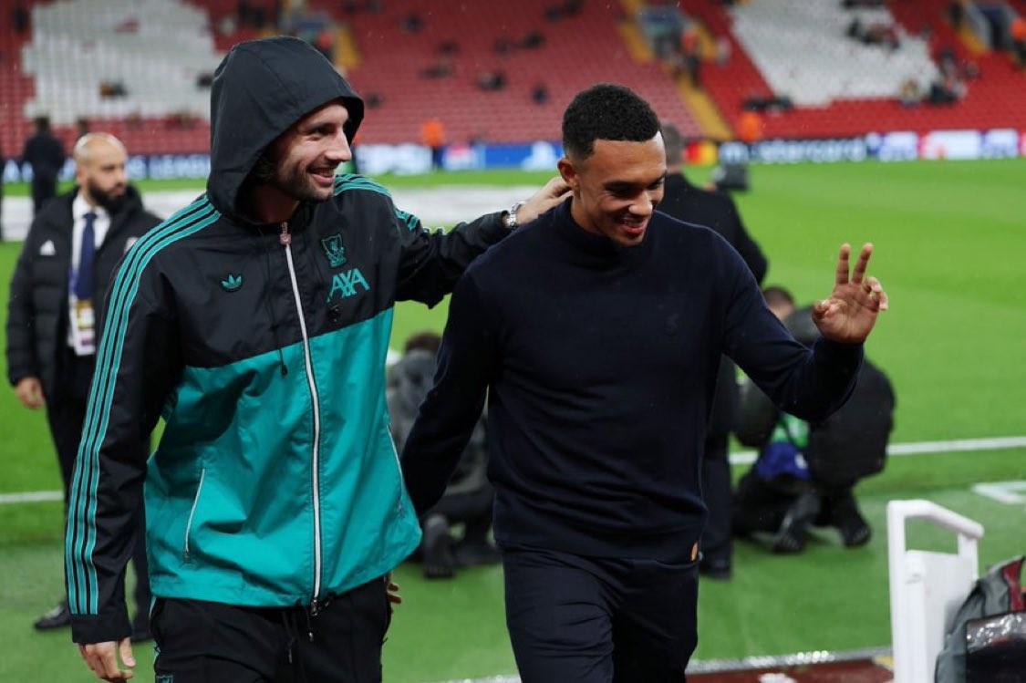 如今,阿諾德代表皇馬重返安菲爾德,進入替補席,賽前,阿諾德和前隊友索博斯洛伊重聚,兩人肩并肩,面帶微笑。