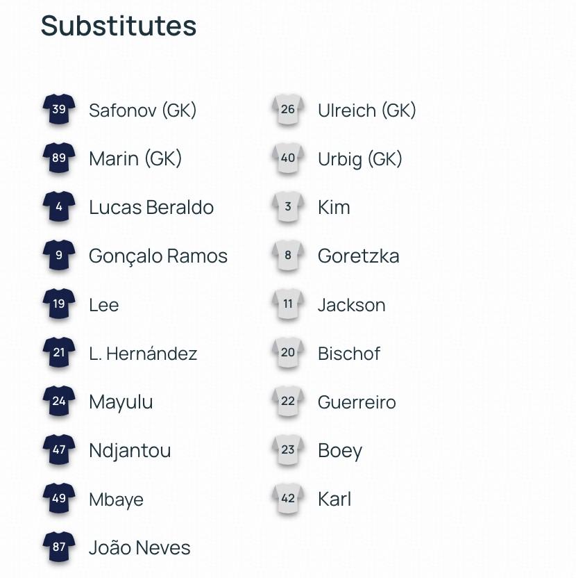 巴黎首發(fā): 30-舍瓦利耶、2-阿什拉夫、5-馬爾基尼奧斯、51-帕喬、25-努諾-門德斯、8-法比安-魯伊斯、17-維蒂尼亞、33-扎伊爾-埃梅里、7-克瓦拉茨赫利亞、29-巴爾科拉、10-登貝萊