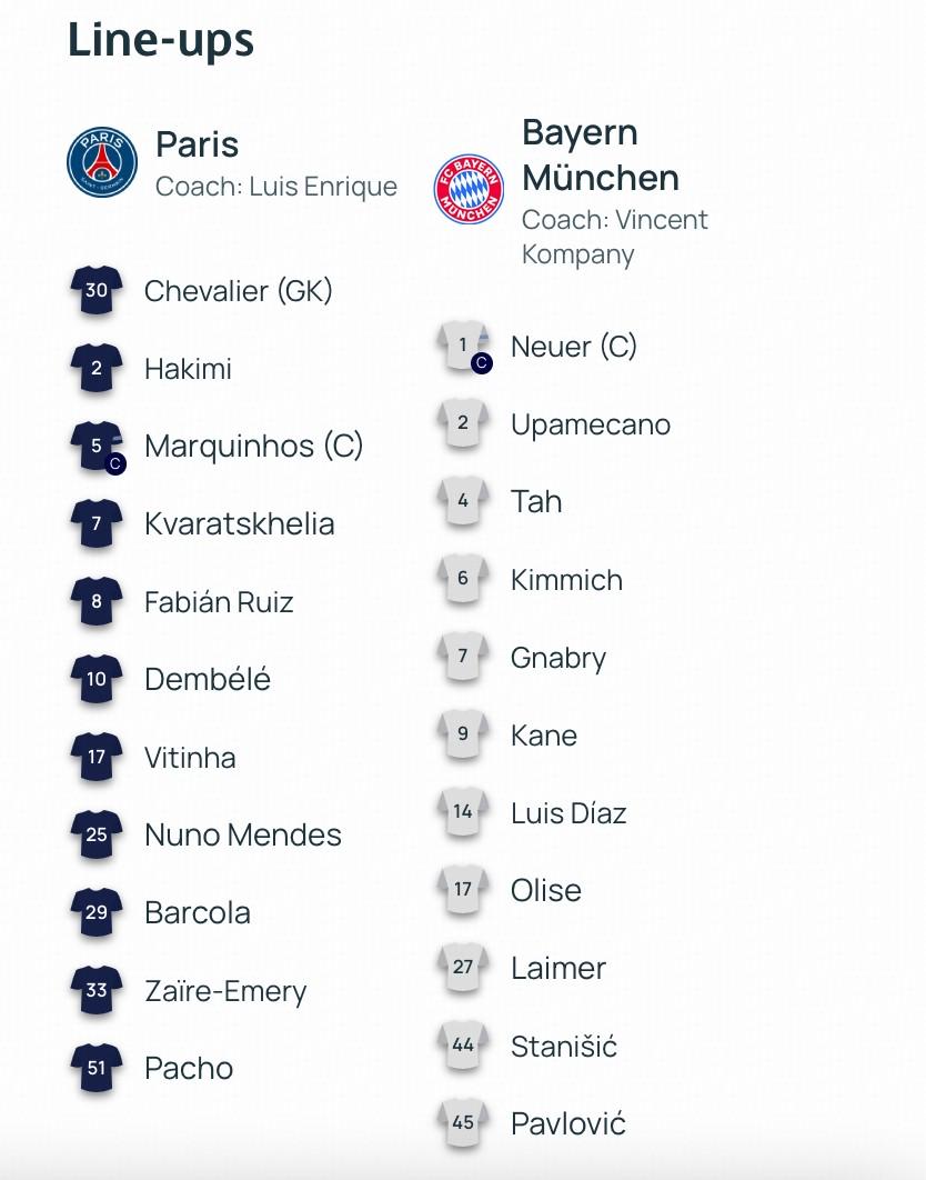北京時間11月5日凌晨4點,歐冠聯(lián)賽階段第4輪 一場焦點戰(zhàn)役,巴黎對陣拜仁。賽前,雙方公布首發(fā)陣容。