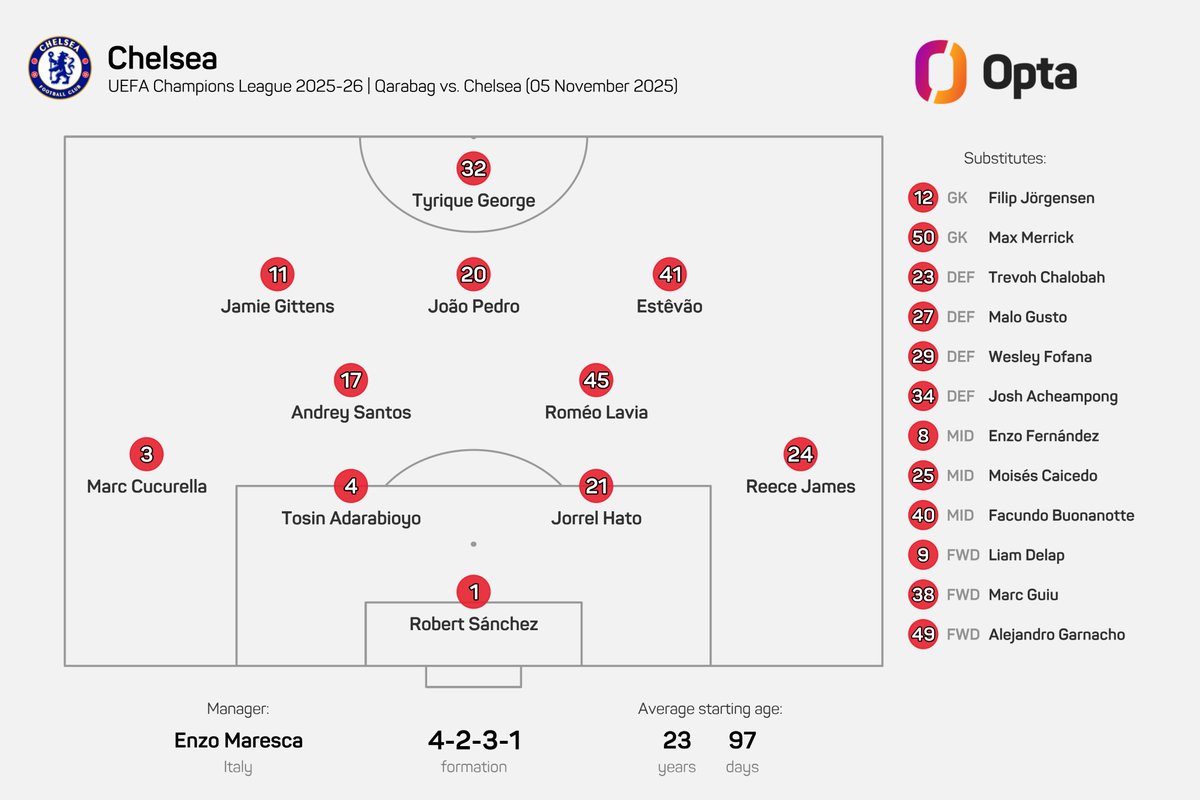 切爾西在本場比賽中排出的首發陣容平均年齡只有23歲97天,這也是英格蘭球隊在歐冠客場比賽中平均年齡第二小的首發陣容,僅次于阿森納在2009年12月對陣奧林匹亞科斯時的首發陣容(21歲215天)。