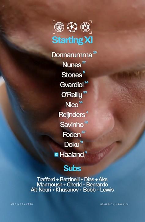 曼城首發: 25-多納魯馬、27-努內斯、5-斯通斯、24-格瓦迪奧爾、33-奧賴利、14-尼科-岡薩雷斯、26-薩維尼奧、4-賴因德斯、47-福登、11-多庫、9-哈蘭德