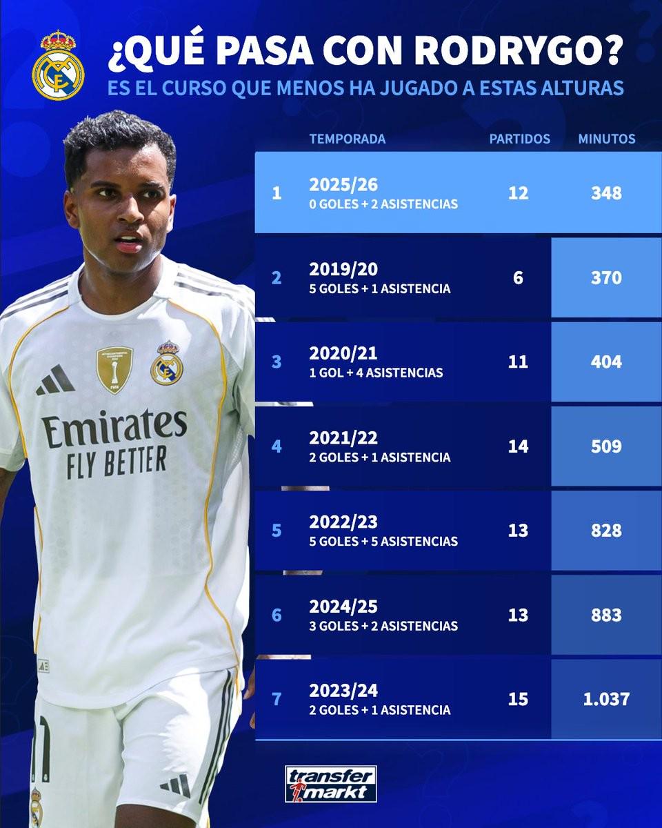 北京時間11月8日,德轉統計出了自羅德里戈2019年夏天加盟皇家馬德里以來,銀河戰艦各個賽季前15場比賽這位巴西球星的出場時間和進球助攻數,其中本賽季羅德里戈在兩項數據上都創造了新低。