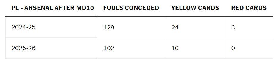 而本賽季同一時間點,盡管早期賽程艱難,阿爾特塔的球隊卻無人被罰下場,且僅收到10張黃牌。他們不僅領跑英超積分榜——在公平競賽榜上也名列前茅。