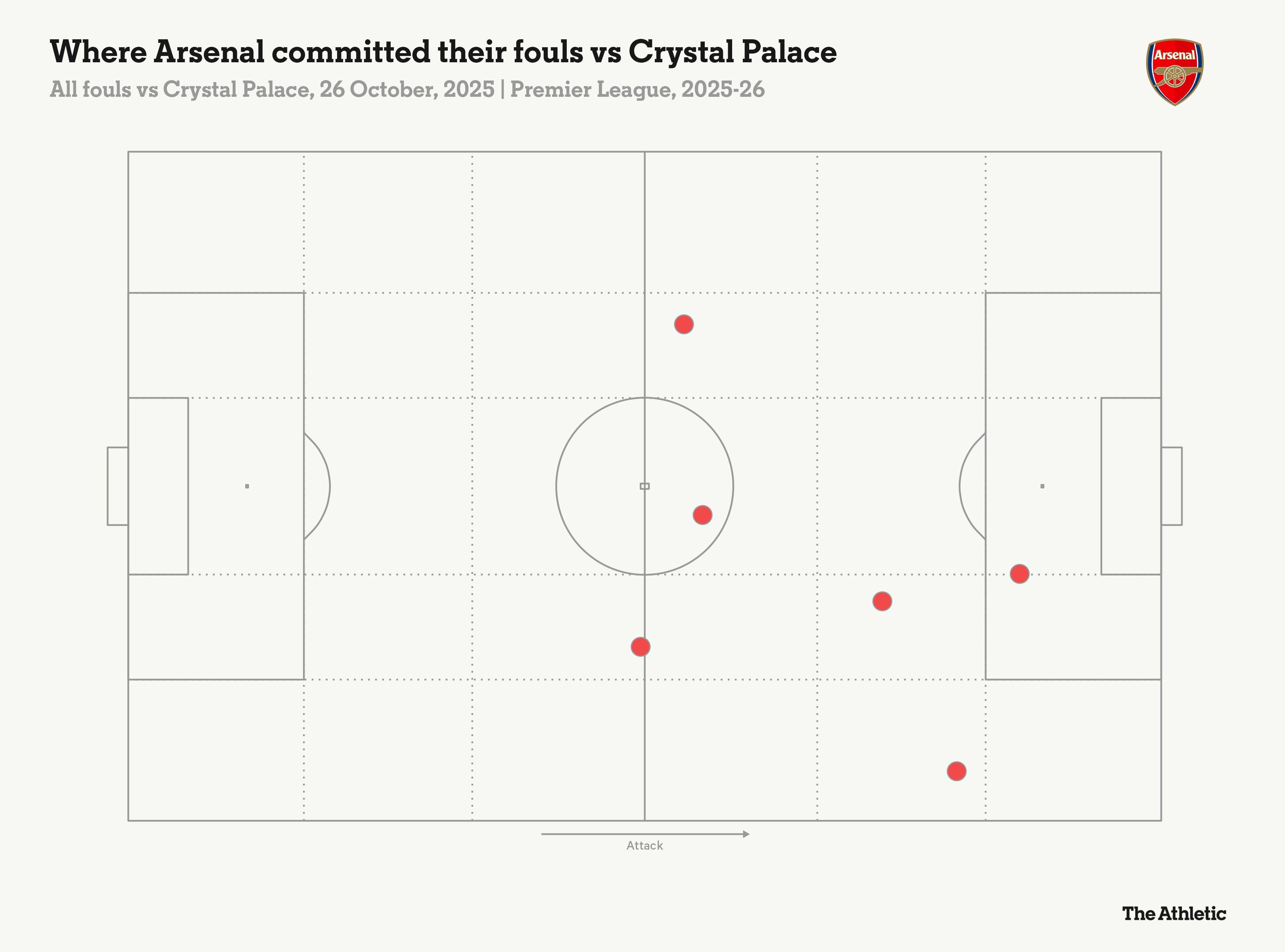 下圖中的圓點標示了阿森納在該場比賽中犯下6次犯規的位置。所有這些犯規都發生在水晶宮的半場。