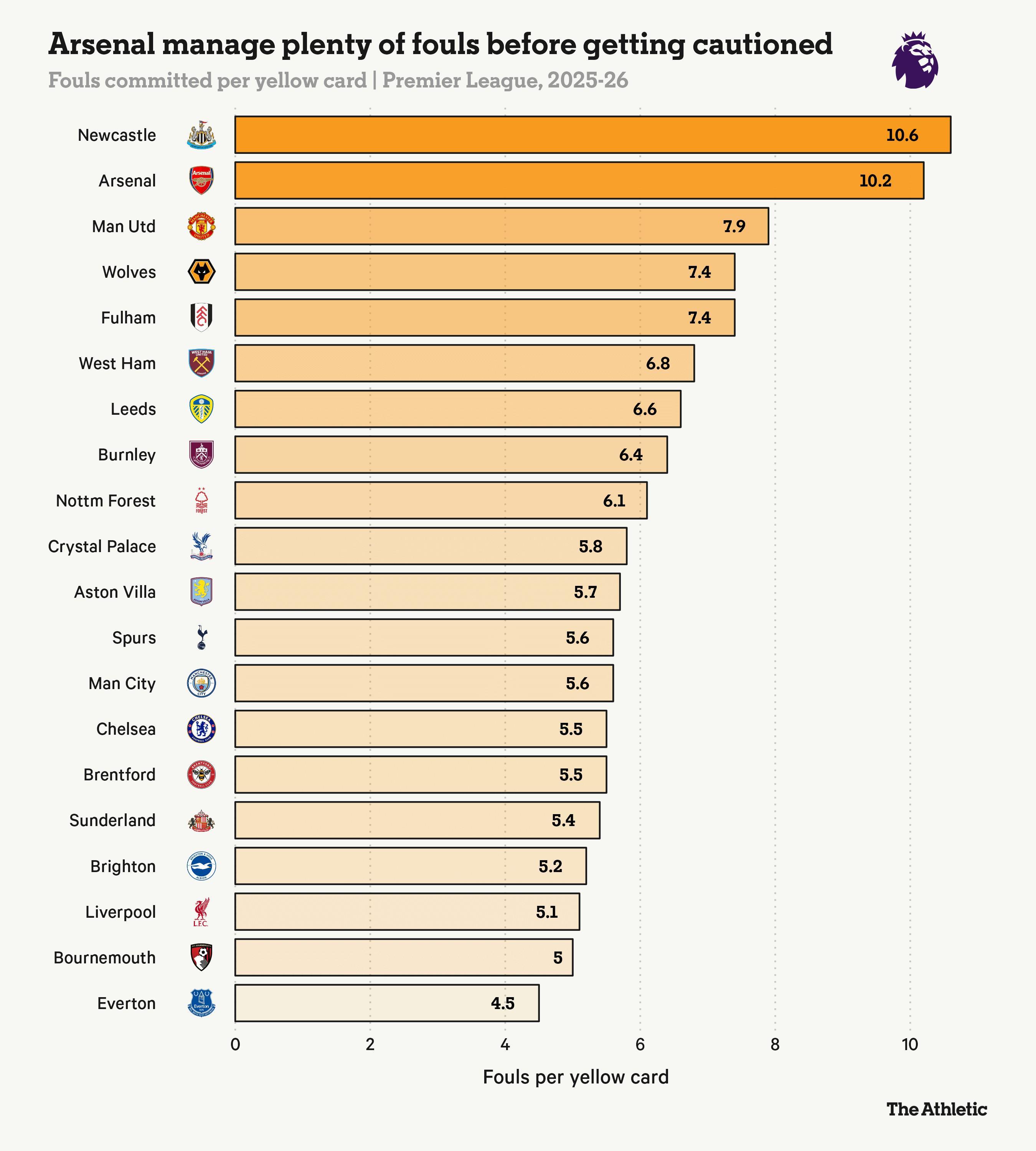 場上的犯規——尤其是那些導致黃牌或紅牌的犯規——常常是在絕望情況下做出的。能夠控制球權,犯規的可能性就會降低。阿森納本賽季英超場均控球率為58.42%——僅切爾西(59.12%)和利物浦(61.71%)高于他們。
