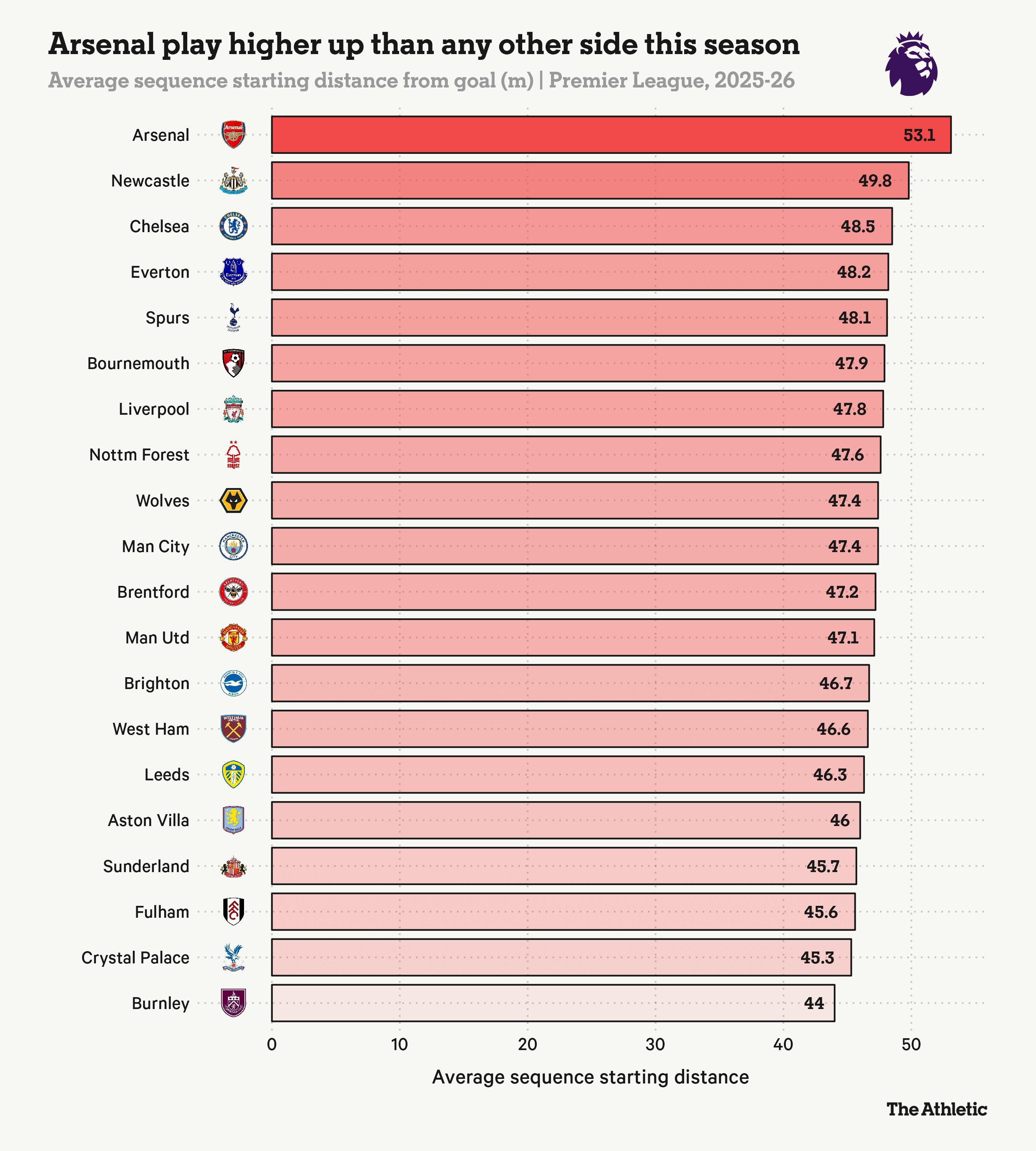 阿森納的紀律記錄也有其結構性因素,例如他們陣型前壓的程度。他們的平均進攻序列起點——Opta 將“進攻序列”定義為 “某一隊連續控球的進攻過程,以防守動作、比賽中斷或射門結束”——達到53.1米,是英超所有球隊中最高的。
