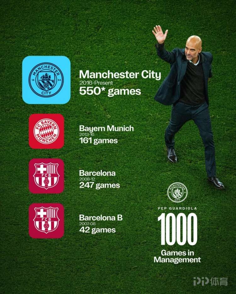 北京時間11月10日凌晨,曼城將在英超第11輪比賽中主場對陣利物浦。此役將是瓜迪奧拉執教生涯帶隊參加的第1000場比賽,曼城官方社媒曬出瓜帥執教場次的分布。