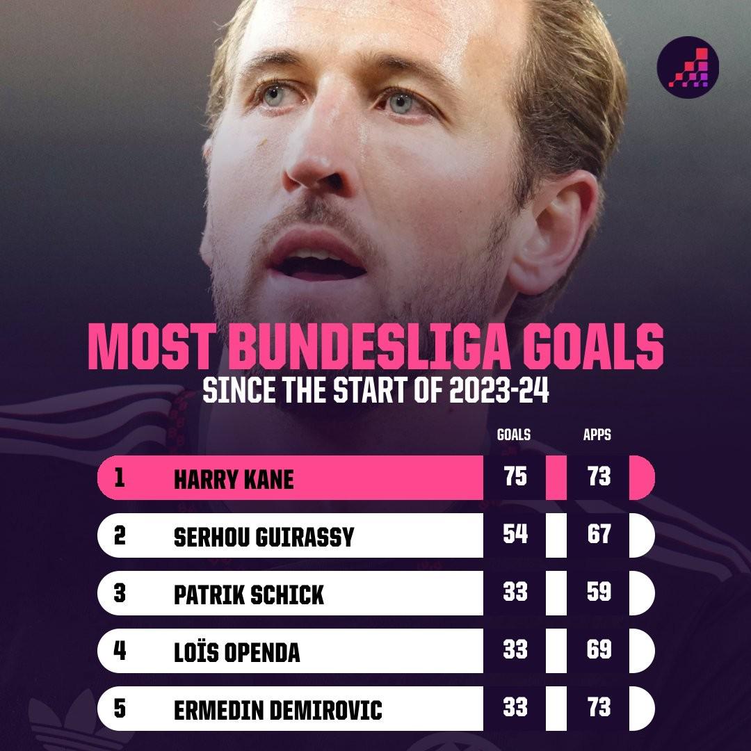 本賽季德甲第10輪,拜仁客場(chǎng)2-2戰(zhàn)平柏林聯(lián)合,凱恩在補(bǔ)時(shí)階段頭球絕平。這場(chǎng)比賽后,凱恩在73場(chǎng)德甲比賽中已打入75球。自2023/24賽季德甲首秀后,凱恩位列同期球員進(jìn)球數(shù)第一。