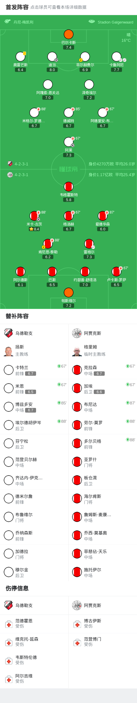 北京時間11月9日荷蘭甲級聯賽 聯賽 第12輪,烏德勒支主場對陣阿賈克斯。烏德勒支迪當破門,阿萊破門。阿賈克斯米卡-古茨破門。最終比分烏德勒支 2-1 阿賈克斯。
