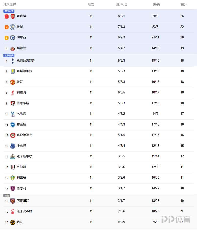 本輪英超,曼城大勝利物浦,積分榜最新情況如圖。目前阿森納26分領跑,曼城22分第2,切爾西20分第3,桑德蘭19分第4。
