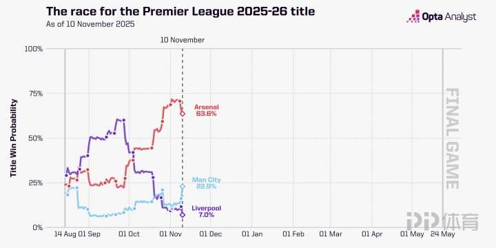 Opta曬英超本賽季截至目前的爭冠概率走勢:利物浦從賽季初被看好跌到目前的7%,阿森納目前63.6%,曼城目前22.9%